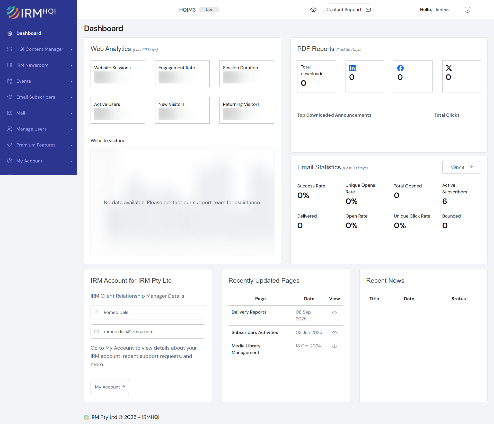 The HQi Dashboard provides a centralised view of website analytics, email statistics, and account information. It’s designed to help you quickly monitor performance and access key features.