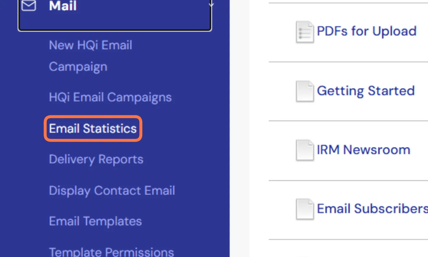 On the left side of your HQi dashboard, you’ll find a "Mail" section and a "Email Statistics" tab under such heading. You’ll need to click the "Email Statistics" link to see all your recent emails.